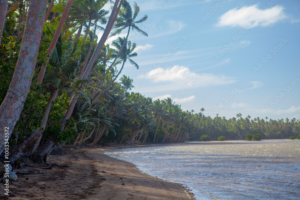 Beautiful tropical island beach with sand and palm trees, blue sky, Fiji