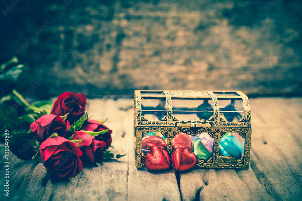 Red roses and heart-shape chocolate for Valentine's Day. Retro style.