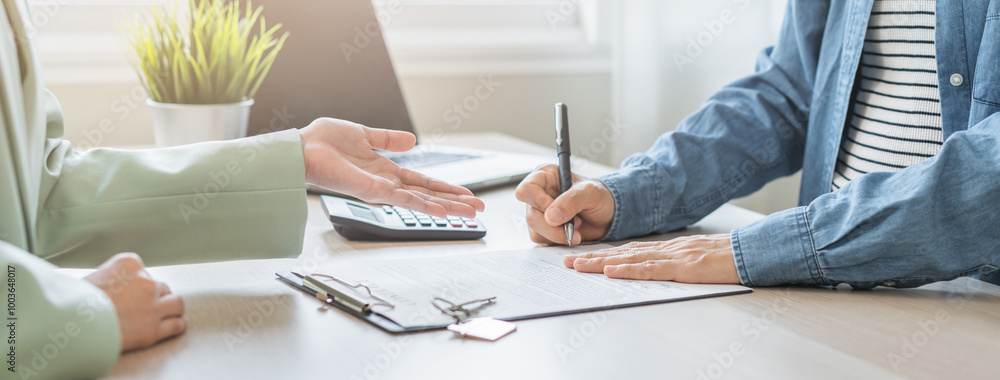 Financial, asian woman lease landlord, agent banker or bonding hand is pointing to contract of tenant, new owner or renter of home to sign signature on purchase, rental property. Estate mortgage.
