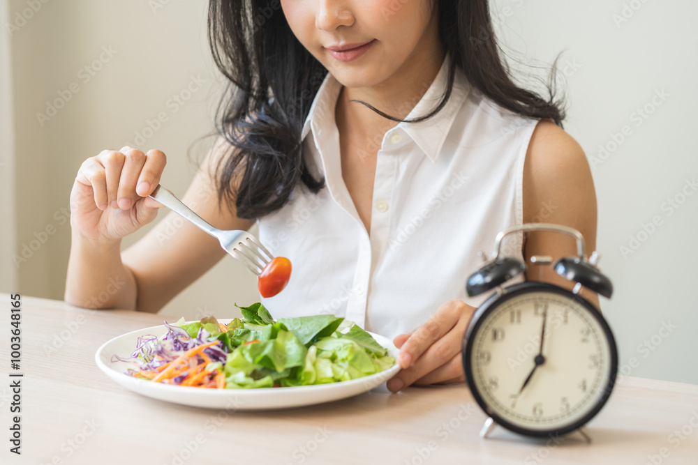 Intermittent fasting with clock, health asian young woman, girl weight loss, eating green fresh vegetable salad on dish, plate with eat healthy of breakfast food in morning, lunch on a table at home.