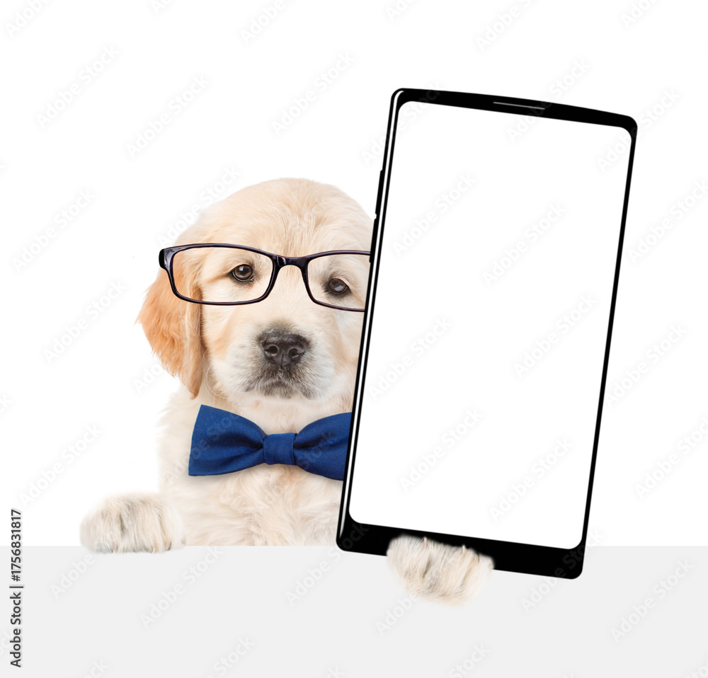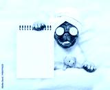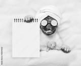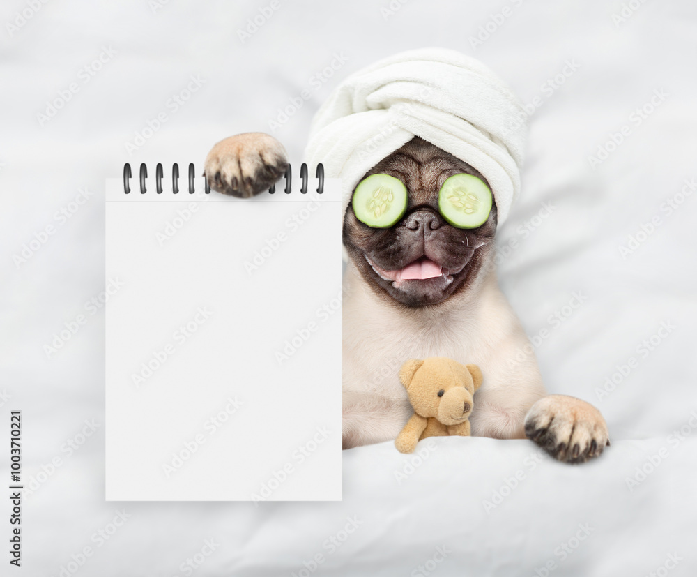 Funny Pug puppy with towel on it head and with pieces of cucumber on it eyes relaxing on the bed at home and showing empty list. Top down view. Empty space for text
