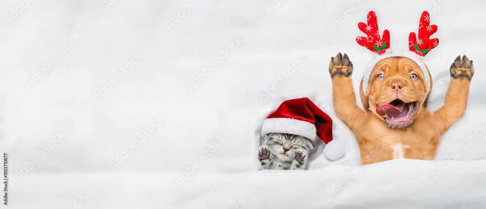 Funny Mastiff puppy dressed like santa claus reindeer Rudolf lying under white blanket at home holds gift box and shows alarm clock. Top down view