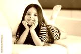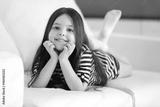 Beautiful little girl lying on sofa in the room