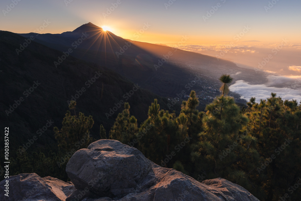 Beautiful sunset from one of the viewpoints. View of Teide and most of the island of Tenerife.