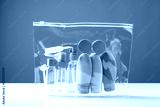 Transparent toiletry bag containing various travel-sized containers on a bright blue background