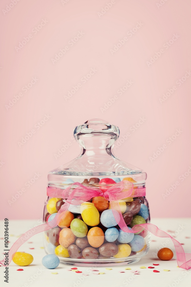 Colorful candy jar decorated with bow ribbon against pink background, gifts for Birthday or Easter
