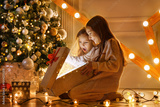 Happy sibling girls opening christmas presents. Children with gift boxes and christmas star. Decorated living room with traditional fire place.