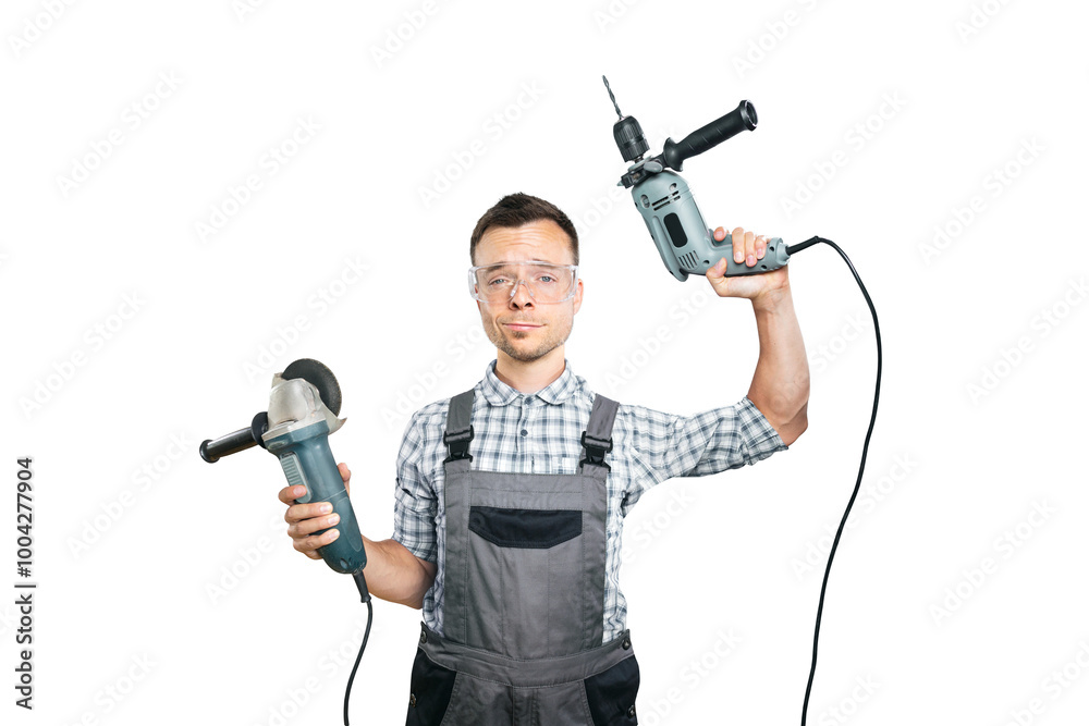 Portrait of a Handyman Holding Power Tools Isolated from Background