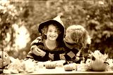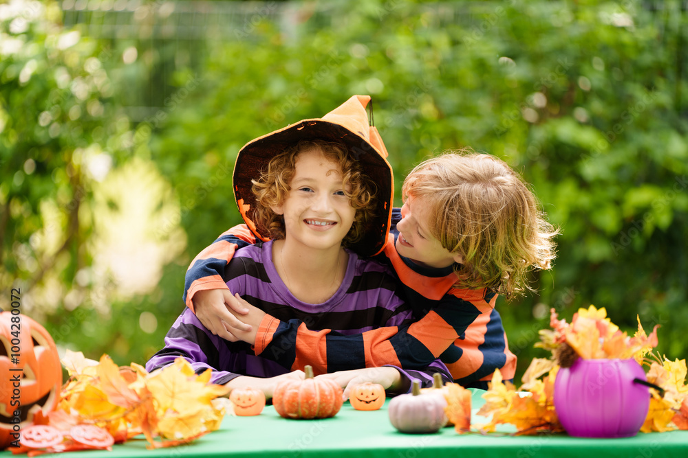 Family decorating home. Halloween arts and crafts.