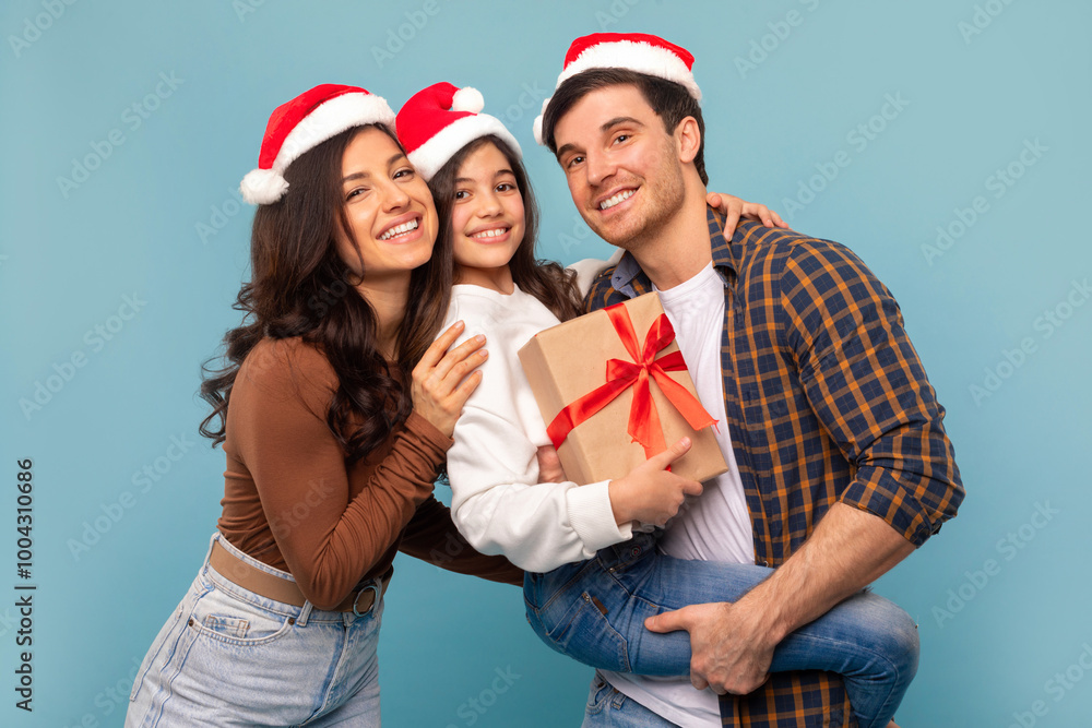 Happy Xmas and New Year holidays. Positive European family with child girl holding Christmas gift, posing over blue background and smiling at camera, wearing Santa hats