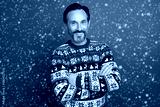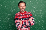 Photo portrait bearded man in sweater smiling with crossed hands isolated pastel green color background