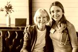 Portrait of friendly nurse cares for elderly woman in nursing home