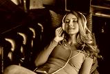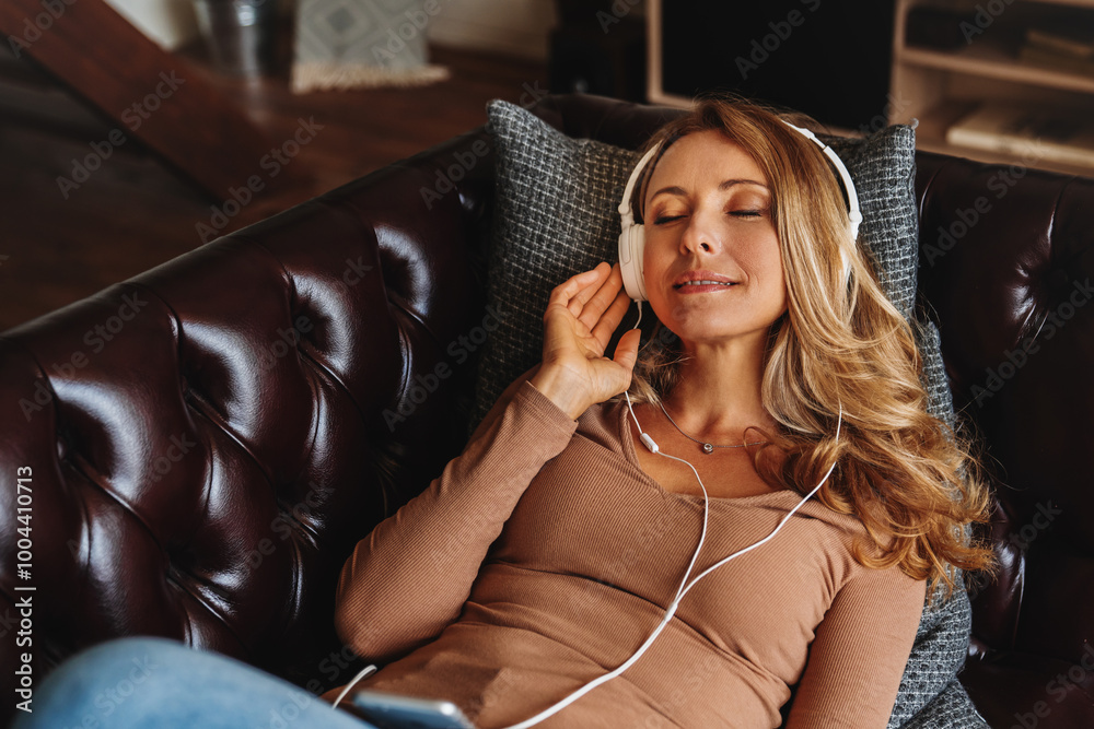 Beautiful smiling woman on home sofa in living room interior enjoying listening to music in headphones