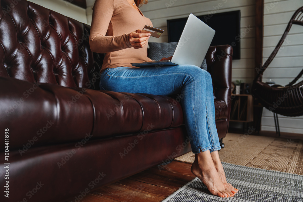 Cropped image of woman sitting on couch and making purchases online with credit card and laptop