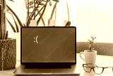 Sad laptop monitor with blue screen error on home office desk with decorative plants and red glasses