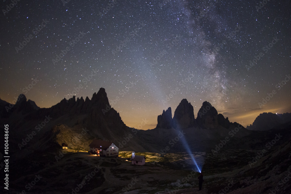Milky way and stars to National Park Tre Cime di Lavaredo. Dolom