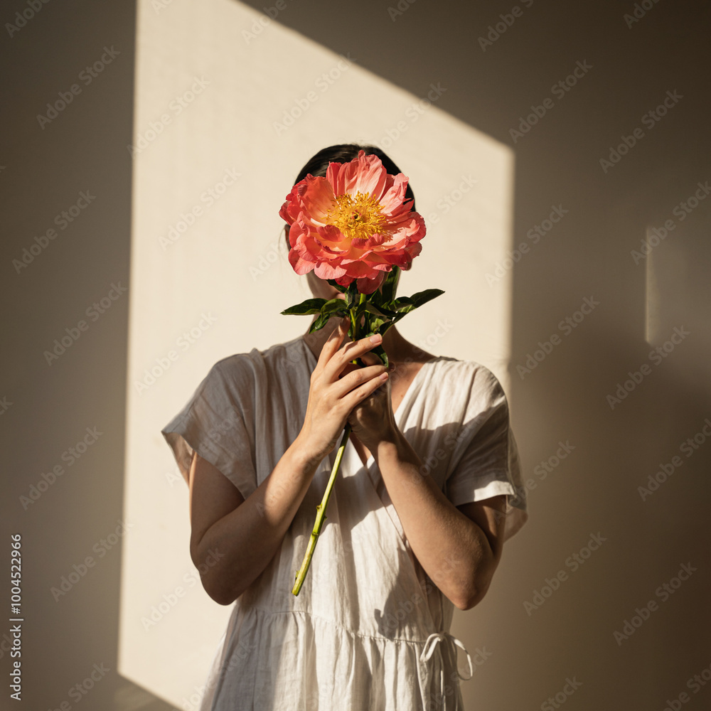 Woman in White Dress Holding Large Flower. Face Hidden, Soft Shadow, Minimalistic Aesthetic, Natural Light, Artistic Composition