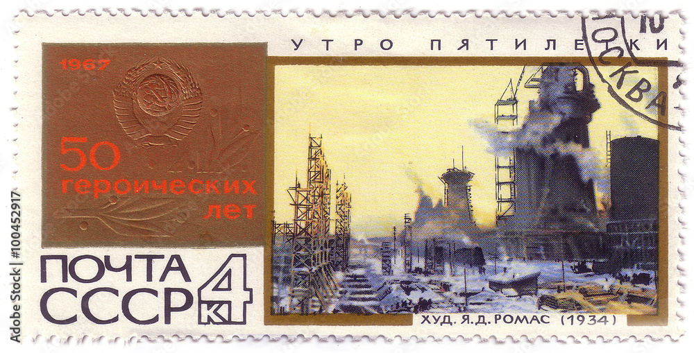 USSR - CIRCA 1967: a post stamp printed in the USSR shows picture "Morning of a five-years period" by Y.D.Romas , devoted 50 heroic years, circa 1967