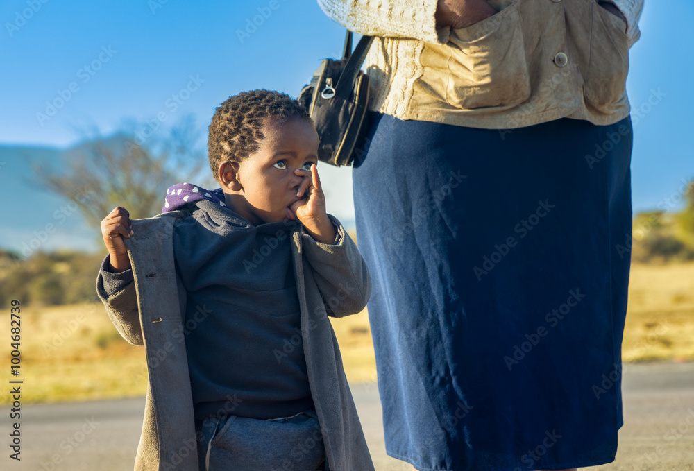 village, portrait african kid girl, going to school kindergarten with her mother, outdoors walking on the road, hand fingers in the mouth