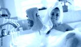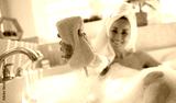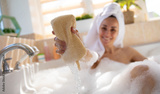 A woman in a towel enjoys a relaxing bath, playfully squeezing a sponge towards the camera, with water dripping down. The bright bathroom and soft bubbles create a refreshing, carefree atmosphere.