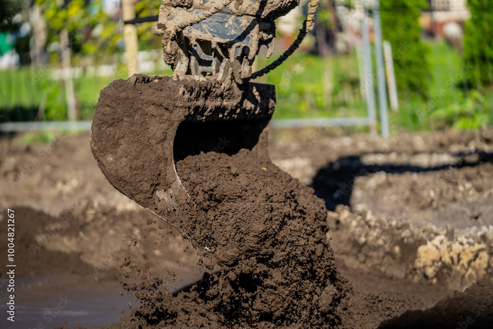 Muddy and dirty excavator digging ground and soil for coming construction project of building new houses