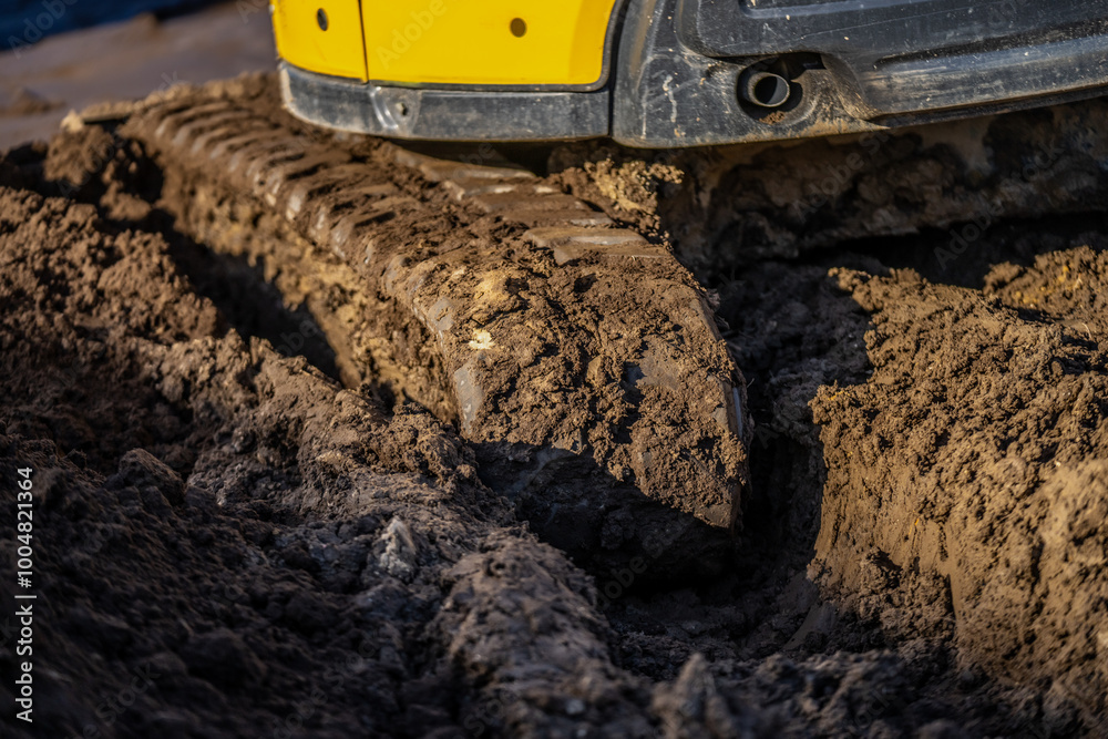 Yellow mini excavator rubber tracks very deep in the construction yard mud at least 5 inches deep