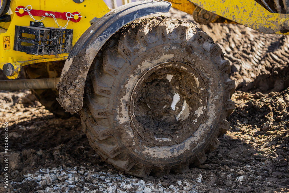 Industrial frontloader wheels and tires close up working in muddy dirty conditions in a construction yard