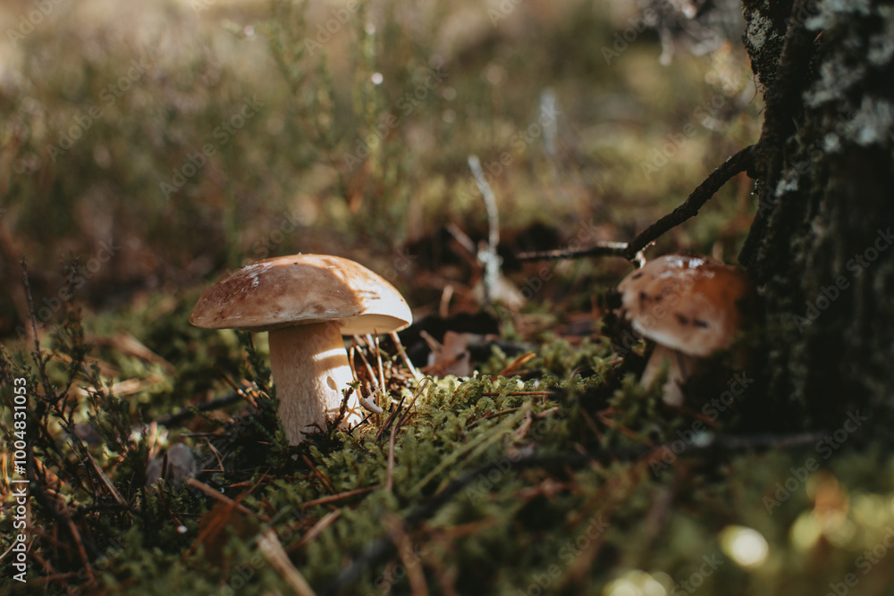 Single penny bun also cep, porcino or porcini (lat. Boletus edulis) mushroom in the mossy forest at autumn