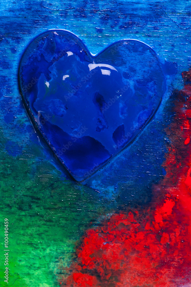 Three-dimensional hand-painted blue heart on colorful background. Gift for Valentine's Day.