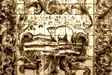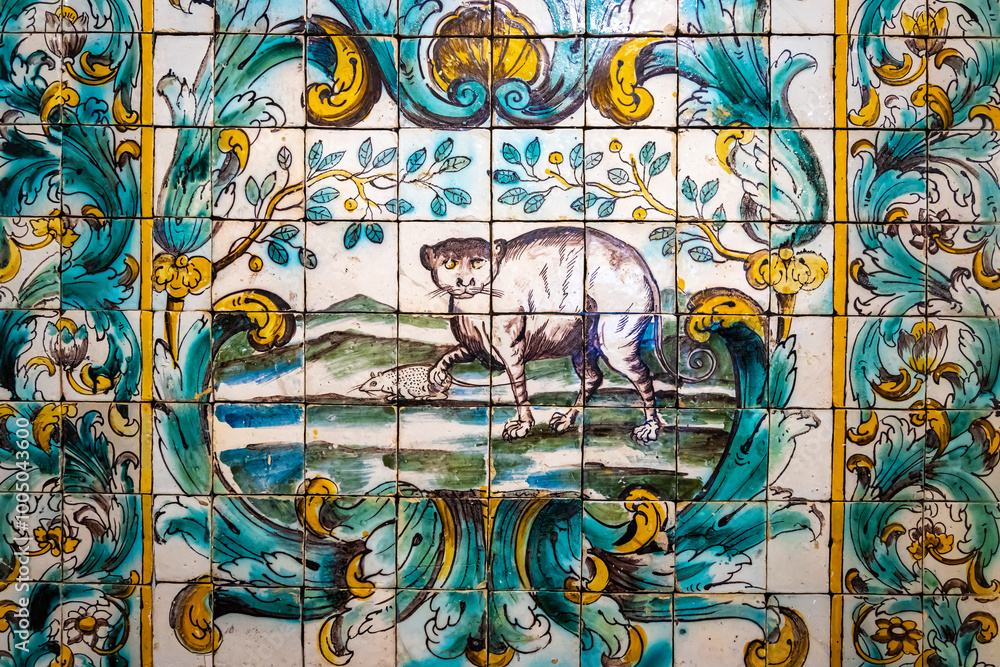 Traditional Portuguese tiles called azulejo, as seen in museum in Lisbon, Portugal