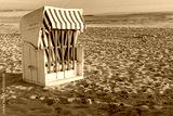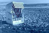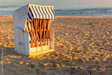 Strandkorb beach chairs on the beach in Swinoujscie, Poland, during sunrise on the Baltic Sea coast