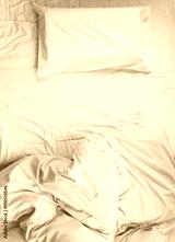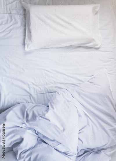 Unmade Bed mattress white Duvet with pillow and blanket Top view