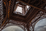 Close-up elements part of Eiffel tower in Paris against dramatic twilight sky at evening summer time.