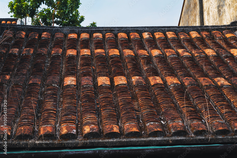 Ancient traditional orange tiles on the roof of an Asian old house in Asia