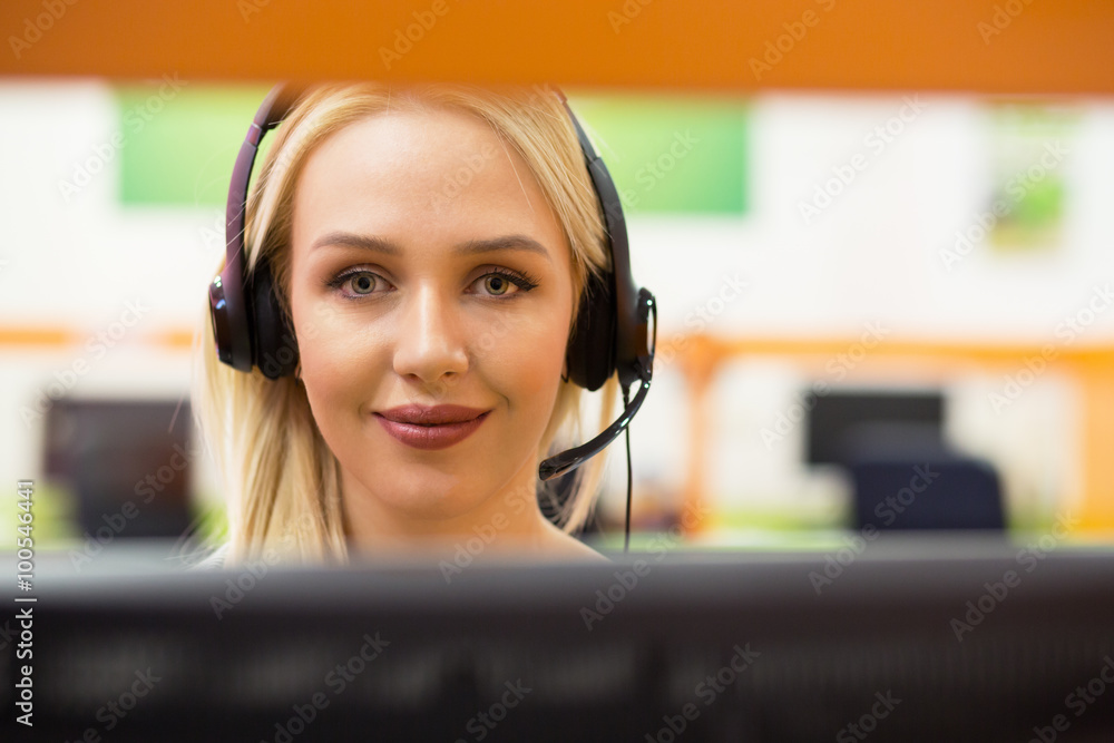 Attractive young woman in suit sitting at call center office and