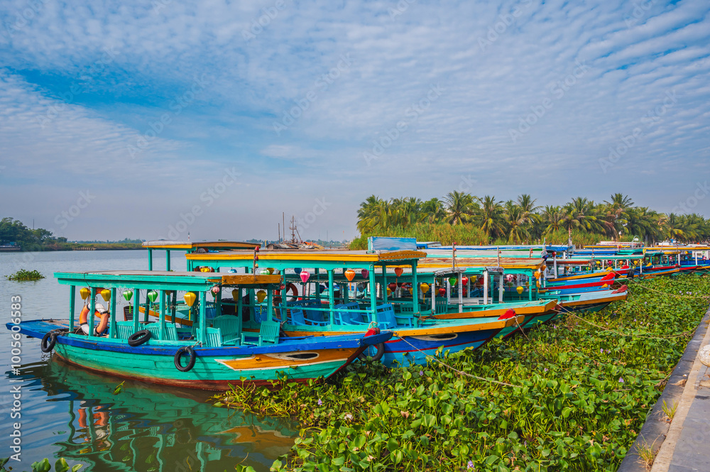 Traditional wooden Vietnamese boats on the Thu bon river in the old town in Hoi An in Vietnam in summer