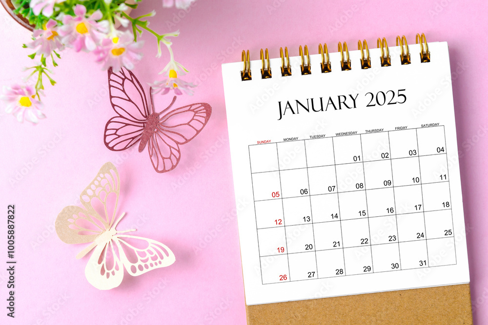 January 2025 desk calendar for the organizer to plan and reminder and paer butterfly on pink background.