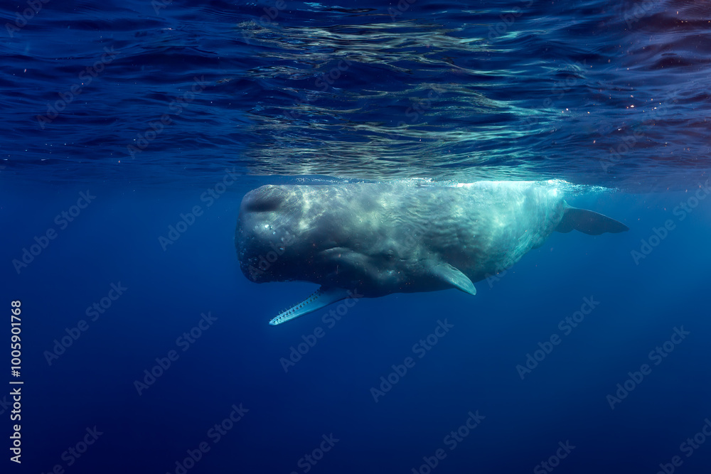 Sperm Whale - Physeter macrocephalus, iconic huge sea mammal and the largest toothed predator from worldwide seas and oceans, Indian ocean, Mauritius.