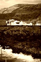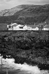 Bright houses on the cliff at Atlantic ocean coast in Azores islands Portugal