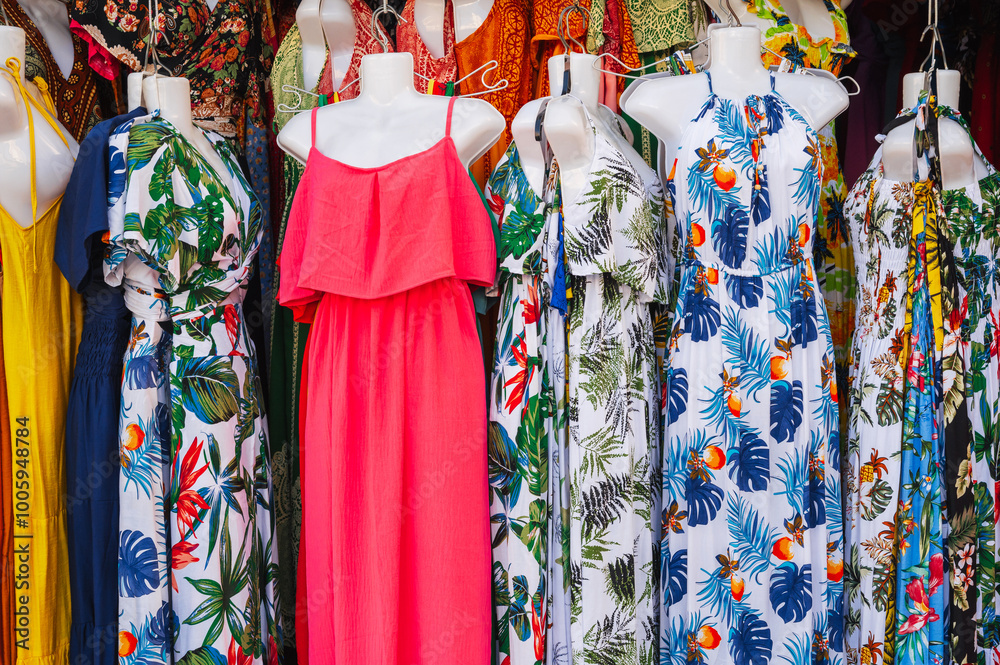 Traditional Asian multicolored silk dresses on the bazaar in Asia in Vietnam