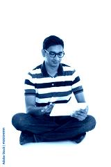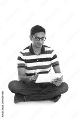 smiling indian male surfing while sitting on the floor