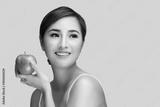Smiling beauty woman holding Green apple while isolated on white