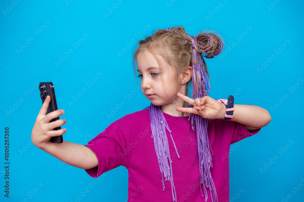 Portrait of little fashion girl with purple braided afro-pigtails dreadlocks wearing pink T-shirt over blue background taking a selfie to send it to friends and followers or post it on social media