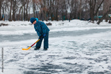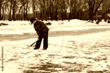 boy playing pond hockey.