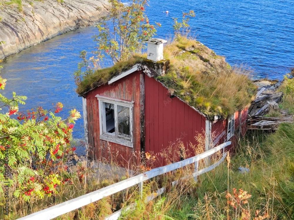 Norwegian red wooden house in a sea bay, beautiful natural still life