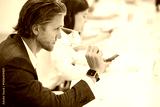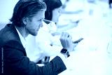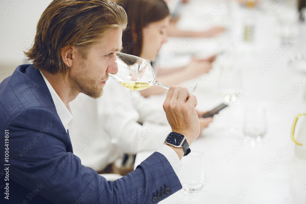 Attractive and mature looking male sommelier tests white wine in a glass during a tasting or winemaking training.