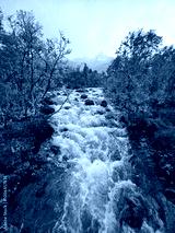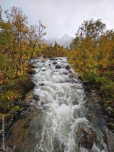 Rapids of a mountain stream in a yellow autumn landscape.
