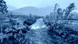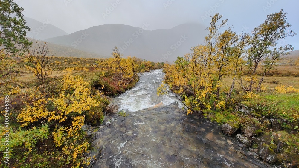 Mountain river rapids in colorful autumn landscape in Norway