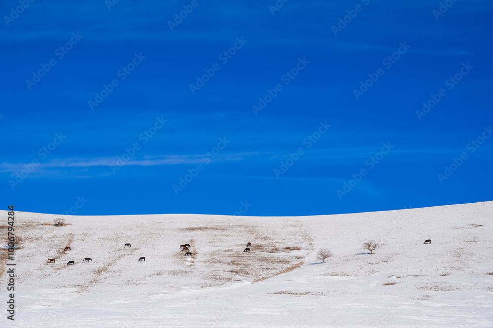 Winter landscape with a herd of horses grazing on snowy slopes in steppes of Kazakhstan
