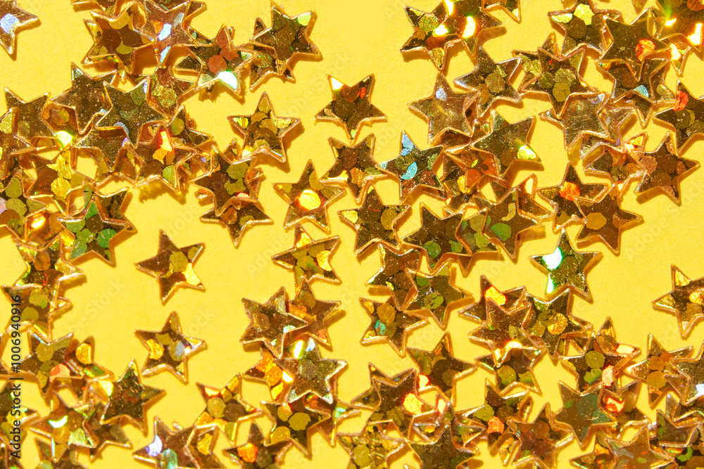 Sparkling golden star confetti on vibrant yellow background for festive celebrations and creative projects.